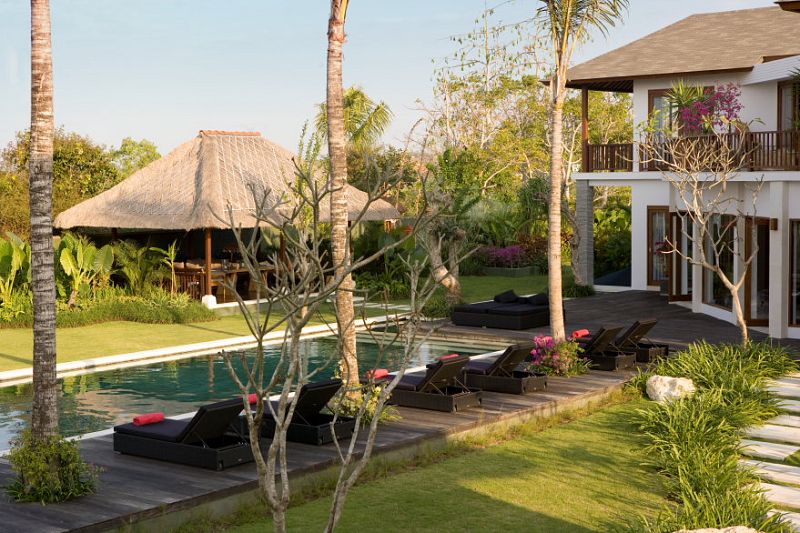 The swimming pool in this private rental villa has an area of 6 meters by 14 meters and is provided with a wooden deck. The swimming pool has fresh water and has large loungers and umbrellas. The garden area is fully landscaped with a group of tropical frangipani trees. On the right side of the swimming pool you have the open air dining and living pavilion that has the alang- alang roof. The dining area is well furnished for relaxed meals with family and friends.