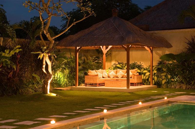 The landscape around the Bali villa rental is dominated by an infinity swimming pool and is completely surrounded by a tropical garden and lush lawns, palm and other green vegetation special to the tropical landscape. The garden has a gazebo and a day bed where you can relax in the natural shade during the hot and humid afternoons with a book or sleep a little.  Due to all these features and amenities, there is no doubt that Seminyak villa Santai is the right place for your stay in Bali and fill your mind with unforgettable memories of a great holiday to cherish for a long time.